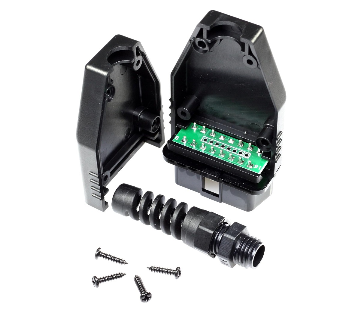 - Soldadura flexible: Las almohadillas de soldadura internas no están conectadas a todos los pines, pero puedes soldar directamente a las conexiones de los pines para habilitar configuraciones específicas. Nota: el cable de tierra está conectado a la carcasa.