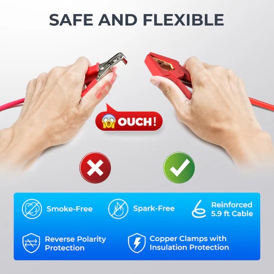 - El dispositivo viene con abrazaderas de cobre grandes, reforzadas, libres de humo y chispas. Su protección contra polaridad inversa evitará daños a la batería, ahorrándole dinero en reparaciones y reemplazos.
