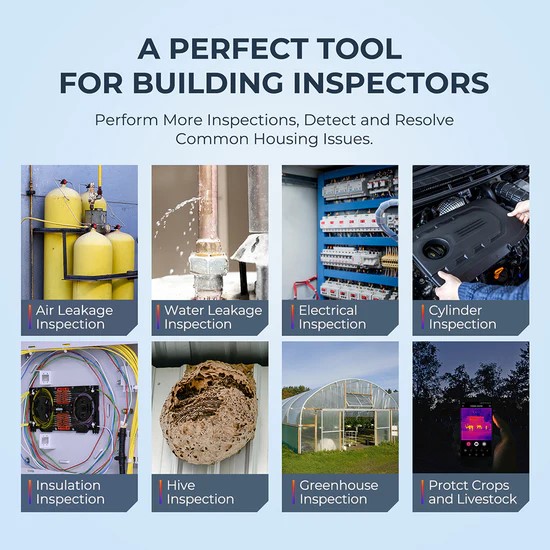- El TC001 es plug and play y no requiere registro si solo lee la temperatura. Esta herramienta es perfecta para trabajos como fines de seguridad, inspección de aislamiento, inspección de cilindros, inspección de fugas de agua e inspección de sistemas HVAC.